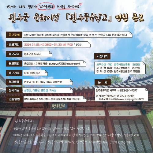 [½Åµ¿¾Æ¹æ¼Û=ÀüÀº¼÷±âÀÚ] ¿ÏÁÖ±ºÀÌ ¡®¿ÏÁÖdz·ùÇб³¡¯ÀÇ »õ À̸§À» ¿À´Â 23ÀϱîÁö °ø¸ðÇÑ´Ù. 4ÀÏ ¿ÏÁÖ±º¿¡ µû¸£¸é ¿ÏÁÖdz·ùÇб³(±³Àå ±èÁ¾´ö)´Â ¼Ò¾ç¸é ¿À¼ºÇÑ¿Á¸¶À» ÀÏ¿ø¿¡ À§Ä¡ÇÑ ÇÑ¿Á °ø¿¬ÀåÀ¸·Î ¡®Ç³·ù¡¯¸¦ ¸Å°³·Î ÀüÅ빮ȭ¸¦ º¸Á¸ Àü½ÂÇϸç ÀüÅ빮ȭ¿¹¼ú üÇè ÇÁ¡¦
