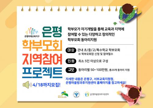 [½Åµ¿¾Æ¹æ¼Û ÀºÆò±¸=À̽ŵ¿±âÀÚ]ÀºÆò±¸´Â ÇкθðÀÇ »çȸÂü¿©¸¦ Àû±Ø Áö¿øÇϰíÀÚ ÀºÆò¹Ì·¡±³À°Áö±¸¿¡¼­ ¡®ÀºÆò±¸ Çкθðȸ Áö¿ªÂü¿© ÇÁ·ÎÁ§Æ®¡¯¸¦ ¸ðÁýÇÑ´Ù°í ¹àÇû´Ù. ¡®ÀºÆò±¸ Çкθðȸ Áö¿ªÂü¿© ÇÁ·ÎÁ§Æ®¡¯´Â Çб³ÀÇ ´ëÇ¥¼ºÀ» °¡Áø Çкθðȸ Ȱµ¿À» Àû±Ø ¹ß±¼‧¡¦