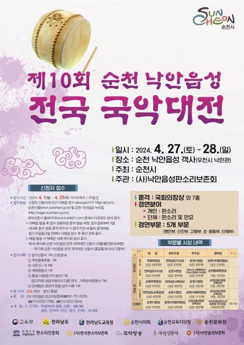[½Åµ¿¾Æ¹æ¼Û ¼øÃµ=±è¿ëÈÆ ±âÀÚ] ¼øÃµ½Ã(½ÃÀå ³ë°ü±Ô)´Â ¼øÃµ ³«¾ÈÀ¾¼º¿¡¼­ ¿À´Â 27ÀϺÎÅÍ 28ÀϱîÁö °³ÃֵǴ ¡®Á¦10ȸ ¼øÃµ ³«¾ÈÀ¾¼º Àü±¹ ±¹¾Ç´ëÀü¡¯ Âü°¡ÀÚ¸¦ 4¿ù 25ÀϱîÁö Á¢¼öÇÑ´Ù°í ¹àÇû´Ù. À̹ø Çà»ç´Â µ¿ÆíÁ¦ÀÇ °ÅÀå ¼Û¸¸°© ±¹Ã¢ÀÇ ÆÇ¼Ò¸®¸¦ °è½ÂÇϰí, ÀüÅë ¡¦