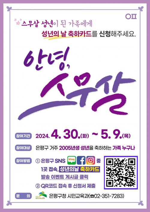 [½Åµ¿¾Æ¹æ¼Û ÀºÆò±¸=À̽ŵ¿±âÀÚ]ÀºÆò±¸´Â Á¦52ȸ ¼º³âÀÇ ³¯À» ¸ÂÀÌÇØ ½º¹« »ìÀÌ µÈ 2005³â»ý ¼º³âµéÀ» ÃàÇÏÇϱâ À§ÇØ ¡®¾È³ç, ½º¹«»ì¡¯ ÃàÇÏÄ«µå ½ÅûÀ» ¹ÞÀ» °èȹÀ̶ó°í ¹àÇû´Ù. ¡®¼º³âÀÇ ³¯¡¯Àº ¸Å³â 5¿ù ¼Â° ¿ù¿äÀÏ¿¡ ½º¹« »ì ¼ºÀÎÀ¸·Î¼­ÀÇ ÀںνÉÀ» ºÎ¿©Çϰí, Ã¥¡¦