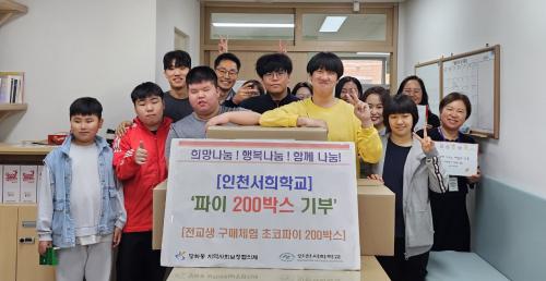 [½Åµ¿¾Æ¹æ¼Û ÀÎõ= À±¹Î½Ä±âÀÚ] ÀÎõ¼­ÈñÇб³ Çлýȸ(ȸÀå Á¤½Â¿ø)¿Í Çкθðȸ(ȸÀå À̼±¾Æ)´Â Áö³­ 7ÀÏ ÇлýµéÀÌ Ã¼ÇèȰµ¿À¸·Î ±¸ÀÔÇÑ ÃÊÄÚÆÄÀÌ·ù 200¹Ú½º¸¦ ´çÇϵ¿ Áö¿ª»çȸº¸ÀåÇùÀÇü(µ¿Àå À±Á¤¾Æ, °øµ¿À§¿øÀå À̹̼÷)¿¡ ±âŹÇß´Ù. ÀÎõ¼­ÈñÇб³ Çкθðȸ´Â À塦