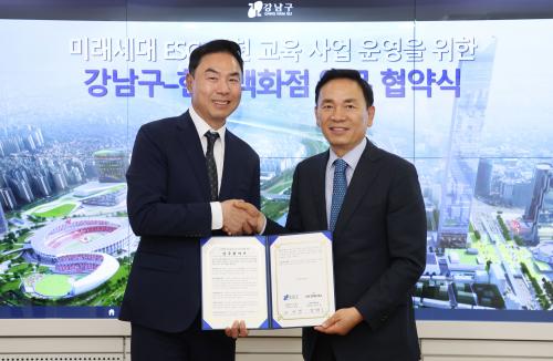 [½Åµ¿¾Æ¹æ¼Û °­³²±¸=À̽ŵ¿±âÀÚ]°­³²±¸°¡ 23ÀÏ ±¸Ã»¿¡¼­ Çö´ë¹éÈ­Á¡(´ëÇ¥ÀÌ»ç Á¤Áö¿µ)°ú ¹Ì·¡¼¼´ë¸¦ À§ÇÑ ESG ½Çõ ±³À°À» À§ÇÑ ¾÷¹« Çù¾àÀ» ü°áÇß´Ù. Çö´ë¹éÈ­Á¡Àº Áö³­ÇØ Çѱ¹ESG±âÁØ¿ø¿¡¼­ »óÀ§ 2.4%(19°÷)¿¡°Ô¸¸ ºÎ¿©ÇÑ A+µî±ÞÀ» ´Þ¼ºÇÒ ¸¸Å­ ESG ȯ°æ ºÐ¾ß¿¡¼­¡¦
