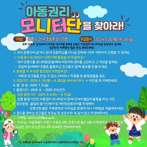 [½Åµ¿¾Æ¹æ¼Û ÀºÆò±¸=À̽ŵ¿±âÀÚ]ÀºÆò±¸´Â ³»´Þ 28ÀϱîÁö ¡®2024³â ÀºÆò±¸ Á¦4±â ¾Æµ¿±Ç¸® ¸ð´ÏÅÍ´Ü¡¯À» ¸ðÁýÇÑ´Ù°í ¹àÇû´Ù. ¡®¾Æµ¿±Ç¸® ¸ð´ÏÅÍ´Ü¡¯Àº ¾Æµ¿Ä£È­µµ½Ã Á¶¼º»ç¾÷ÀÇ ÀÏȯÀ¸·Î ¾Æµ¿ÀÇ ÀǰßÀ» ±¸Á¤¿¡ ¹Ý¿µÇϱâ À§ÇØ 2021³âºÎÅÍ ±Â³×À̹ö½º ¼­¿ïÁߺÎÁöºÎ¿Í °ø¡¦