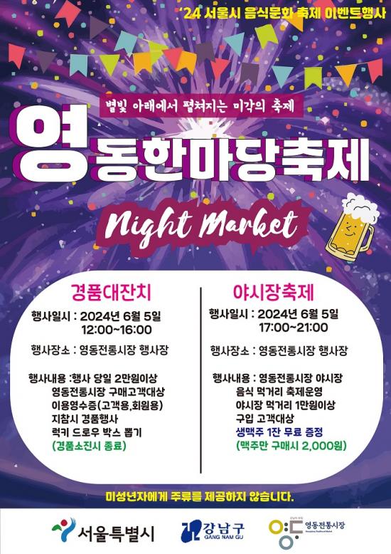 [½Åµ¿¾Æ¹æ¼Û °­³²±¸=À̽ŵ¿±âÀÚ]°­³²±¸ÀÇ ¿µµ¿ÀüÅë½ÃÀåÀÌ ÀÌ»öÀ½½ÄÀ» Áñ±â´Â ¾ß½ÃÀåÀ¸·Î º¯½ÅÇÏ´Â ¿µµ¿ÇѸ¶´çÃàÁ¦°¡ ¿À´Â 5ÀÏ ¿­¸°´Ù. ÀÌ Çà»ç´Â ¿µµ¿ÀüÅë½ÃÀåÀÌ ¼­¿ï½Ã ÀüÅë½ÃÀå À̺¥Æ® »ç¾÷¿¡ ¼±Á¤µÇ¸é¼­ »óÀεéÀÌ ´Ù ÇÔ²² Âü¿©ÇØ ÁغñÇÑ´Ù. 17½Ã~21½Ã¿¡ ½ÃÀå Àϴ롦