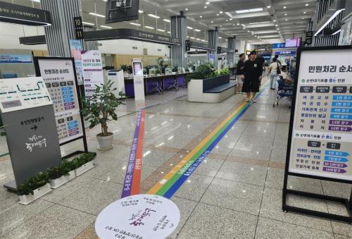 [½Åµ¿¾Æ¹æ¼Û µ¿´ë¹®±¸=À̽ŵ¿±âÀÚ]¼­¿ï µ¿´ë¹®±¸(±¸Ã»Àå ÀÌÇÊÇü)´Â ÁֹΠÆíÀǸ¦ À§ÇØ ÃÖ±Ù Á¾Çչοø½Ç ¹Ù´Ú¿¡ ¡®¹Î¿ø ¾È³»¼±¡¯À» ºÎÂøÇϰí, ¹Î¿ø¾È³» Àü´ãÀηÂÀ» Ãß°¡ ¹èÄ¡Çß´Ù°í 24ÀÏ ¹àÇû´Ù. ±¸Ã» 1Ãþ Á¾Çչοø½Ç¿¡´Â ¿©·¯ ºÎ¼­(¹Î¿ø¿©±Ç°ú, ÀÚµ¿Â÷°ü¸®°ú µî)°¡ ÇÔ¡¦