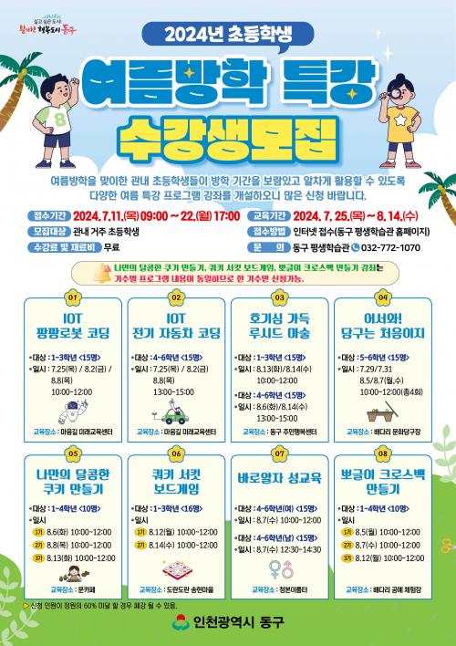[½Åµ¿¾Æ¹æ¼Û ÀÎõ= À±¹Î½Ä±âÀÚ] ÀÎõ µ¿±¸(±¸Ã»Àå ±èÂùÁø) Æò»ýÇнÀ°üÀº ¿©¸§¹æÇÐÀ» ¸Â¾Æ °ü³» ÃʵîÇлýÀ» ´ë»óÀ¸·Î ´Ù¾çÇÑ ¿©¸§¹æÇРƯ°­À» ¿î¿µÇÑ´Ù°í ¹àÇû´Ù. ¼ö°­½ÅûÀº µ¿±¸ Æò»ýÇнÀ°ü ȨÆäÀÌÁö¸¦ ÅëÇØ ¼±Âø¼øÀ¸·Î ½Åû °¡´ÉÇÏ¸ç ¼ö°­·á ¹× Àç·áºñ´Â ¹«·á´Ù¡¦