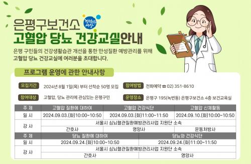 [½Åµ¿¾Æ¹æ¼Û=À̽ŵ¿±âÀÚ] ÀºÆò±¸(±¸Ã»Àå ±è¹Ì°æ)´Â ±¸¹ÎµéÀÇ °Ç°­»ýȰ½À°ü °³¼±À» ÅëÇÑ ¸¸¼ºÁúȯ ¿¹¹æ°ü¸®¸¦ À§ÇØ °íÇ÷¾Ð, ´ç´¢, ÀÌ»óÁöÁúÇ÷Áõ¿¡ °üÇÑ ¡®ÇϹݱ⠰ǰ­±³½Ç¡¯À» ¿À´Â 9¿ùºÎÅÍ 11¿ù±îÁö ¿î¿µÇÑ´Ù°í ¹àÇû´Ù. ÀºÆò±¸´Â °ü³» 65¼¼ Àα¸°¡ 20%·Î Ãʰí·É»çȸ¿¡¡¦