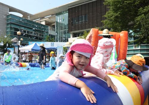 [½Åµ¿¾Æ¹æ¼Û=À̽ŵ¿±âÀÚ]²ÞÀÌ ¸ðÀÌ´Â µµ½Ã, ¹Ì·¡¸¦ ±×¸®´Â °­³²±¸(±¸Ã»Àå Á¶¼º¸í) ¼¼°îµ¿Áֹμ¾ÅÍ ¾Õ¸¶´ç¿¡¼­ 14ÀÏ ¿­¸° ¹°³îÀÌÀå¿¡¼­ ¾ÆÀ̵éÀÌ ½Ã¿øÇÑ ¹°³îÀ̸¦ Áñ±â¸ç ¹«´õÀ§¸¦ ÂѰí ÀÖ´Ù. ¼¼°îµ¿Áֹμ¾ÅÍ´Â ¹æÇÐÀ» ¸ÂÀº ¾î¸°À̵éÀ» À§ÇØ ¡º´õÀ§¾ß~³îÀÚ!¡»¹°³îÀÌ¡¦
