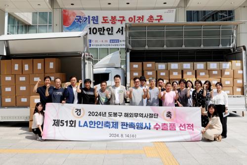 [½Åµ¿¾Æ¹æ¼Û=À̽ŵ¿±âÀÚ]LA ÇÑÀÎÃàÁ¦¿¡¼­ ¼±º¸ÀÏ µµºÀ±¸ Áö¿ª Áß¼Ò±â¾÷‧¼Ò»ó°øÀÎ Á¦Ç°µéÀÌ ¹Ì±¹ ¼±Àû±æ¿¡ ¿Ã¶ú´Ù. µµºÀ±¸(±¸Ã»Àå ¿À¾ð¼®)´Â 8¿ù 14ÀÏ µµºÀ±¸Ã» Á¤¹® ±¤Àå¿¡¼­ LA ÇÑÀÎÃàÁ¦ ÆÇÃËÇà»ç ¼öÃâǰ ¼±Àû½ÄÀ» °³ÃÖÇß´Ù°í ¹àÇû´Ù. ¿ÃÇØ´Â Áö³­ÇØ ¹°·®¡¦