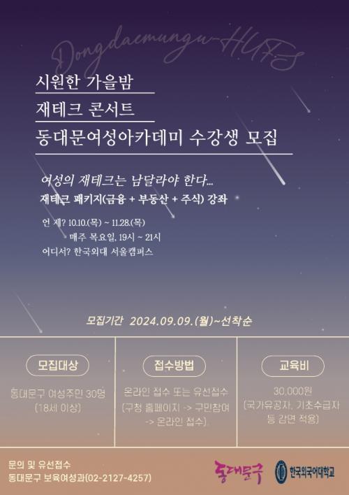 [½Åµ¿¾Æ¹æ¼Û=ÀÌ¿ø¼º±âÀÚ] µ¿´ë¹®±¸(±¸Ã»Àå ÀÌÇÊÇü)°¡ ¡®2024³â µ¿´ë¹®¿©¼º¾ÆÄ«µ¥¹Ì ÀçÅ×Å© Äܼ­Æ®¡¯ ¿¡ Âü¿©ÇÒ ¼ö°­»ýÀ» ¼±Âø¼ø ¸ðÁýÇÑ´Ù. µ¿´ë¹®¿©¼º¾ÆÄ«µ¥¹Ì´Â µ¿´ë¹®±¸ °ÅÁÖ ¿©¼ºÀ» ´ë»óÀ¸·Î ¹è¿òÀÇ ±âȸ¸¦ Á¦°øÇÏ¿© ÁöÀû ¿å±¸¸¦ ÃæÁ·½Ã۰í, »çȸÀû ´É·ÂÀ» Çâ»ó½Ã¡¦