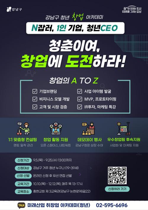 [½Åµ¿¾Æ¹æ¼Û=À̽ŵ¿±âÀÚ] ²ÞÀÌ ¸ðÀÌ´Â µµ½Ã, ¹Ì·¡¸¦ ±×¸®´Â °­³²±¸(±¸Ã»Àå Á¶¼º¸í)°¡ ¿À´Â 25ÀϱîÁö ¡®¹Ì·¡»ê¾÷ û³â â¾÷¾ÆÄ«µ¥¹Ì¡¯¿¡ Âü¿©ÇÒ ±³À°»ýÀ» ¸ðÁýÇÑ´Ù. °­³²±¸¿¡ °ÅÁÖ ÁßÀÎ 19~39¼¼ û³âÀÌ¸é ´©±¸³ª Âü¿©ÇÒ ¼ö ÀÖÀ¸¸ç, Æ÷½ºÅÍ ¶Ç´Â Çö¼ö¸·¿¡ ÀμâµÈ QRÄڵ塦