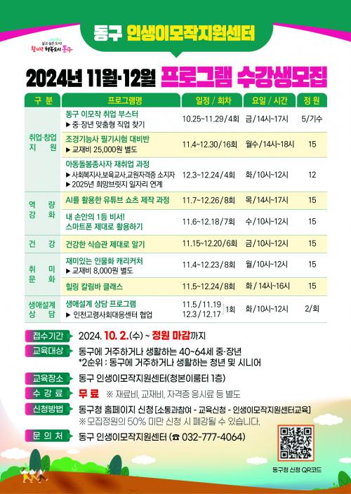 ÀÎõ µ¿±¸ ÀλýÀ̸ðÀÛÁö¿ø¼¾ÅÍ, 11¡¤12¿ù ÇÁ·Î±×·¥ ¼ö°­»ý ¸ðÁý
