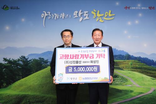 [½Åµ¿¾Æ¹æ¼Û °æ³²ÇÔ¾È=À̽ŵ¿±âÀÚ] ÇԾȱºÀº Áö³­ 20ÀÏ ÇÔ¾È¸é ºÀ¼º¸® ¼ÒÀç ½ÅÁø¹°»ê(ÁÖ) Ç㼺¹Î ´ëÇ¥°¡ ÇԾȱº¿¡ °íÇâ»ç¶û±âºÎ±Ý ÃÖ°í¾×ÀÎ 500¸¸ ¿øÀ» ±âºÎÇß´Ù°í ¹àÇû´Ù. Ç㼺¹Î ´ëÇ¥´Â ¼ö»ê¹°°¡°ø¡¤Á¦Á¶¾÷ÀÇ ÅëÁ¶¸² Á¦Ç° Àü¹® »ý»ê ±â¾÷ ½ÅÁø¹°»ê(ÁÖ)¸¦ ¿î¿µÇÏ°í¡¦