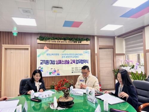 [½Åµ¿¾Æ¹æ¼Û Àü³²±¤¾ç=À̽ŵ¿±âÀÚ] Àü¶ó³²µµ±¤¾ç±³À°Áö¿øÃ»Àº 11¿ù 27ÀÏ ±¤¾ç±³À°Áö¿øÃ» ±³À°Àå½Ç¿¡¼­ Çѱ¹½Ã¹Î¾ÈÀü±³À°ÁøÈï¿ø ¼øÃµ¡¤±¤¾ç¾ÈÀü±³À°¼¾ÅÍ¿Í ¾÷¹«Çù¾àÀ» ü°áÇß´Ù. À̹ø Çù¾àÀº Çб³¿¡¼­ ¹ß»ýÇÒ ¼ö ÀÖ´Â ÀÀ±Þ»óȲ¿¡ ´ëºñÇØ ±³Á÷¿øµéÀÇ ÀÀ±Þóġ ¿ª·®À»¡¦