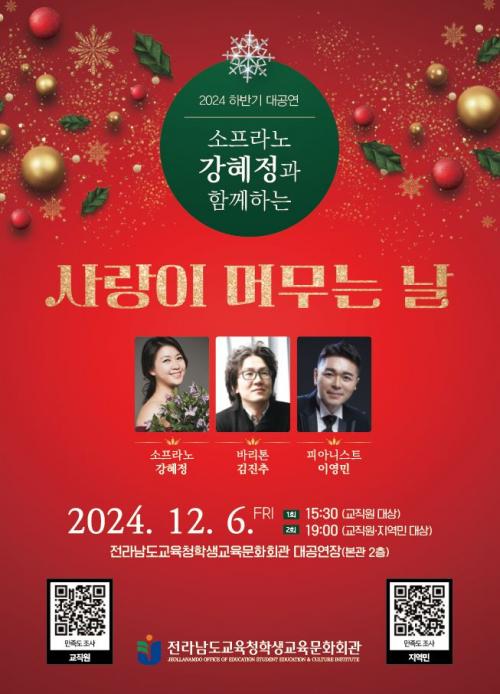 [½Åµ¿¾Æ¹æ¼Û Àü³²=À̽ŵ¿±âÀÚ] Àü¶ó³²µµ±³À°Ã»Çлý±³À°¹®È­È¸°üÀÌ ÇÑÇØ¸¦ ¸¶¹«¸®ÇÏ´Â ¿¬¸»À» ¸Â¾Æ ±³Á÷¿ø°ú Áö¿ª¹ÎÀ» ´ë»óÀ¸·Î µû¶æÇÑ ¹®È­¿¹¼ú°ø¿¬À» ¼±º¸ÀδÙ. ¿À´Â 12¿ù 6ÀÏ ¿ÀÈÄ 3½Ã30ºÐ°ú Àú³á 7½Ã Àü³²±³À°Ã»Çлý±³À°¹®È­È¸°ü ´ë°ø¿¬Àå¿¡¼­¡®»ç¶ûÀÌ ¸Ó¹«´Â ³¯¡¦