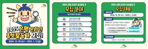 [½Åµ¿¾Æ¹æ¼Û ÀºÆò±¸=À̽ŵ¿±âÀÚ] ÀºÆò±¸´Â ¿À´Â 1¿ù 3ÀϱîÁö ¡®2025³â ÀºÆò ¿Â¶óÀÎ È«º¸È°µ¿°¡¡¯¸¦ ¸ðÁýÇÑ´Ù°í ¹àÇû´Ù. ¡®2025³â ÀºÆò ¿Â¶óÀÎ È«º¸È°µ¿°¡¡¯´Â ÃÑ 5°³ ºÐ¾ß 11¸íÀ» ¸ðÁýÇÑ´Ù. SNS ¼­Æ÷ÅÍÁî 2¸í, »çÁøÈ«º¸È°µ¿°¡ 3¸í, 1ÀÎ Å©¸®¿¡ÀÌÅÍ 2¸í, ¹Ý·Áµ¿¹° Å©¸®¡¦