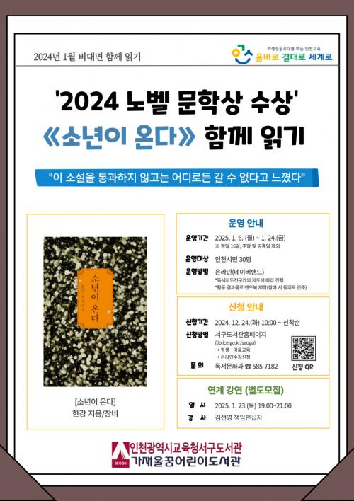 [½Åµ¿¾Æ¹æ¼Û ÀÎõ= À±¹Î½Ä±âÀÚ] ÀÎõ±¤¿ª½Ã±³À°Ã»¼­±¸µµ¼­°ü(°üÀå ¹ÚÁ¤Èñ)Àº 2025³â ¡®ºñ´ë¸é ÇÔ²² Àб⡯ ÇÁ·Î±×·¥ÀÇ Ã¹ ¹øÂ° µµ¼­·Î ÇѰ­ ÀÛ°¡ÀÇ ¡º¼Ò³âÀÌ ¿Â´Ù¡»¸¦ ¼±Á¤ÇÏ¿© 1¿ù 6ÀϺÎÅÍ 24ÀϱîÁö ¿î¿µÇÑ´Ù. ÀÎõ½Ã¹Î ´©±¸³ª Âü¿©ÇÒ ¼ö ÀÖ´Â ¡®ºñ´ë¸é ÇÔ²² Àб⡦