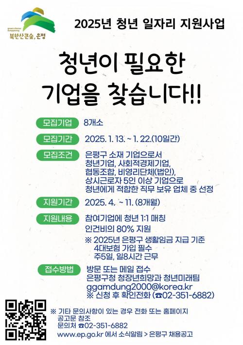 [½Åµ¿¾Æ¹æ¼Û ÀºÆò±¸=À̽ŵ¿±âÀÚ] ÀºÆò±¸´Â û³â ±¸Á÷³­ ÇØ¼Ò¸¦ À§ÇØ ¡®2025³â û³â ÀÏÀÚ¸®»ç¾÷¡¯¿¡ Âü¿©ÇÒ ±â¾÷ ¶Ç´Â ´Üü¸¦ ¸ðÁýÇÑ´Ù°í ¹àÇû´Ù. û³â ÀÏÀÚ¸®»ç¾÷Àº û³â¿¡°Ô ÀûÇÕÇÑ Áö¿ª ÀÏÀÚ¸®¸¦ ¹ß±¼Çϰí Á¦°øÇØ Ã»³âµéÀÇ °æÁ¦È°µ¿°ú Á÷¹«¿ª·® °­È­¸¦ Áö¿øÇÏ´Â »ç¡¦