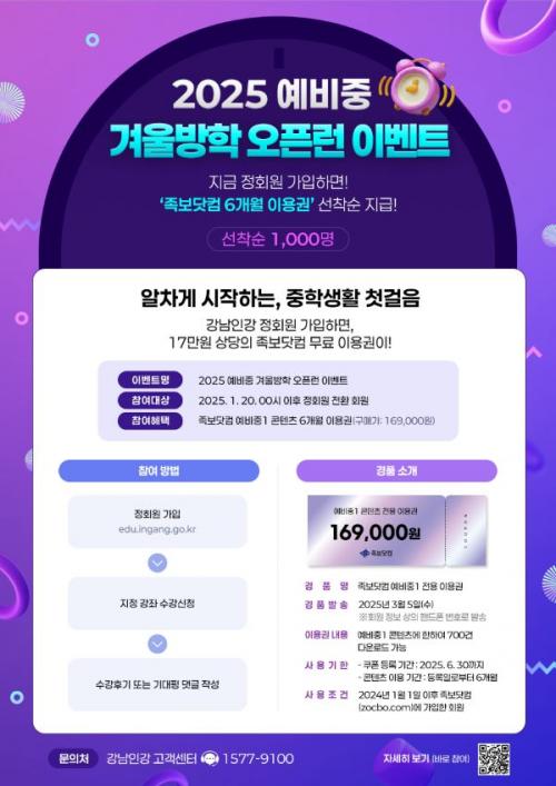 [½Åµ¿¾Æ¹æ¼Û °­³²±¸=À̽ŵ¿±âÀÚ] ²ÞÀÌ ¸ðÀÌ´Â µµ½Ã, ¹Ì·¡¸¦ ±×¸®´Â °­³²±¸°¡ ¿î¿µÇÏ´Â ¿Â¶óÀÎ ±³À° Ç÷§Æû °­³²Àΰ­(edu.ingang.go.kr)ÀÌ 1¿ù 20ÀϺÎÅÍ 2¿ù 28ÀϱîÁö ¿¹ºñ ÁßÇлý 1000¸íÀ» ´ë»óÀ¸·Î Á·º¸´åÄÄ 6°³¿ù ÀÌ¿ë±Ç(16¸¸ 9õ ¿ø »ó´ç)À» ¹«·á·Î Á¦°øÇÏ´Â ¡®2025 ¡¦