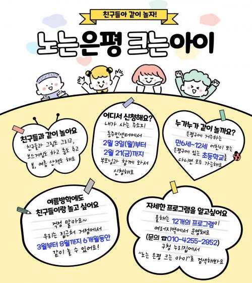 [½Åµ¿¾Æ¹æ¼Û ÀºÆò±¸=À̽ŵ¿±âÀÚ] ÀºÆò±¸´Â 3ÀϺÎÅÍ ¿À´Â 21ÀϱîÁö ¡®³ë´Â ÀºÆò, Å©´Â ¾ÆÀÌ¡¯ ÀÌ¿ëÀÚ¸¦ ¸ðÁýÇÑ´Ù°í ¹àÇû´Ù. ¡®³ë´Â ÀºÆò, Å©´Â ¾ÆÀÌ¡¯´Â ½Ç³»¿Ü ÅëÇÕÇü ³îÀÌÇÁ·Î±×·¥À¸·Î À¯¿£¾Æµ¿±Ç¸®Çù¾à Á¦31Á¶¿¡ µû¶ó, ¾Æµ¿ÀÌ ÀûÀýÇÑ È޽İú ¿©°¡¸¦ Áñ±â¸ç ³î ±Ç¸®¡¦
