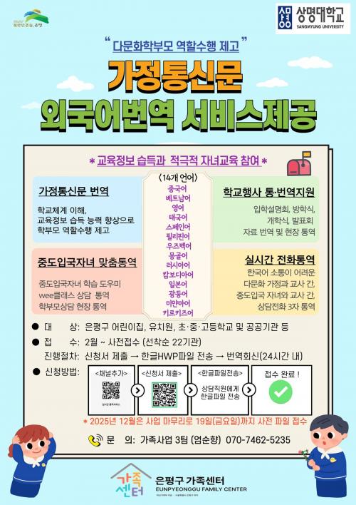 [½Åµ¿¾Æ¹æ¼Û ÀºÆò±¸=À̽ŵ¿±âÀÚ] ÀºÆò±¸´Â ÀÌ´ÞºÎÅÍ ¿À´Â 12¿ù±îÁö ¿Ü±¹ÀÎ ÁÖ¹ÎÀ» Æ÷ÇÔÇÑ °ü³» ´Ù¹®È­ °¡Á¤À» À§ÇØ °¡Á¤Åë½Å¹® µî ±³À° ¹®¼­¿¡ ´ëÇÑ Åë¹ø¿ª ¼­ºñ½º¸¦ °ü³» ±³À°±â°üÀ» ´ë»óÀ¸·Î Áö¿øÇÑ´Ù°í ¹àÇû´Ù. ¡®°¡Á¤Åë½Å¹® ¹ø¿ª »ç¾÷¡¯Àº ¾î¸°ÀÌÁý, À¯Ä¡¿ø, Ãʵ