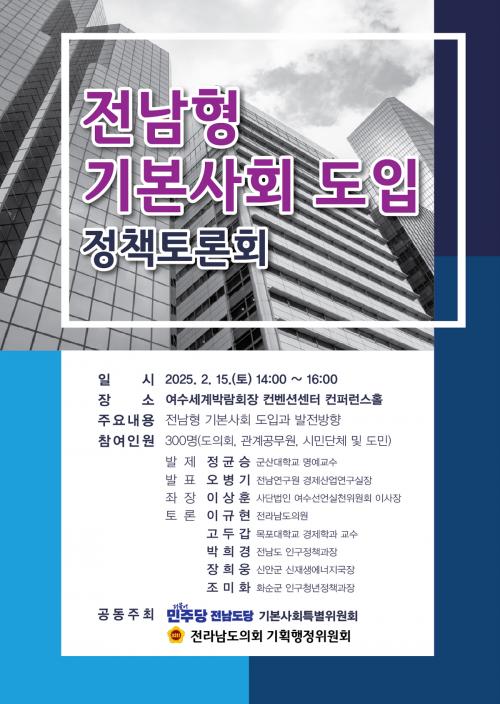 [½Åµ¿¾Æ¹æ¼ÛÀü³²¿©¼ö=±è±â³² ±âÀÚ] Àü¶ó³²µµÀÇȸ °­¹®¼º ±âȹÇàÁ¤À§¿øÀå(´õºÒ¾î¹ÎÁÖ´ç¤ý¿©¼ö3)Àº 2¿ù 15ÀÏ(Åä) ¿ÀÈÄ 2½Ã ¿©¼ö¼¼°è¹Ú¶÷ȸÀå ÄÁº¥¼Ç¼¾ÅÍ ÄÁÆÛ·±½ºÈ¦¿¡¼­ ¡®Àü³²Çü ±âº»»çȸ µµÀÔ Á¤Ã¥Åä·Ðȸ¡¯¸¦ °³ÃÖÇÑ´Ù. À̹ø Åä·Ðȸ´Â Àü³²Çü ±âº»»çȸ ½Ã¹ü»ç¾÷¡¦