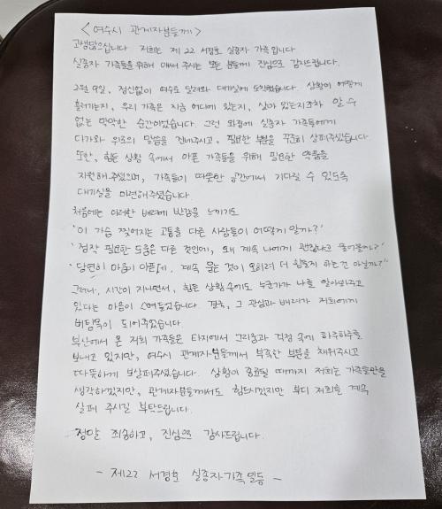 [½Åµ¿¾Æ¹æ¼ÛÀü³²¿©¼ö=±è±â³² ±âÀÚ] Á¦22¼­°æÈ£ ħ¸ô »ç°í ½ÇÁ¾ÀÚ °¡Á·ÀÌ ¿©¼ö½Ã¿¡ °¨»ç ÆíÁö¸¦ ÀüÇÑ »ç½ÇÀÌ µÚ´Ê°Ô ¾Ë·ÁÁ³´Ù. 18ÀÏ ¿©¼ö½Ã¿¡ µû¸£¸é ½ÇÁ¾ÀÚ 3°¡Á·Àº °¡Á·´ë±â½Ç¿¡¼­ Áö¿ø ±Ù¹« ÁßÀÎ ÇÑ °ø¹«¿øÀ» ÅëÇØ ¹°Ç° ¹× ÀÇ·á Áö¿ø¿¡ ´ëÇÑ °¨»çÀÇ ¶æÀ» ÀüÇß´Ù¡¦
