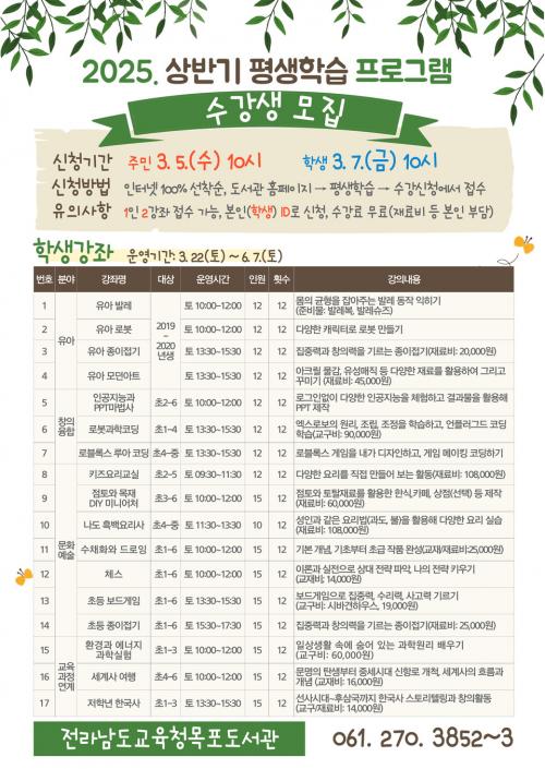 [½Åµ¿¾Æ¹æ¼Û Àü³²¸ñÆ÷=À̽ŵ¿±âÀÚ] Àü¶ó³²µµ±³À°Ã»¸ñÆ÷µµ¼­°üÀº 3¿ù 5ÀÏ(¼ö)ºÎÅÍ 3¿ù 11ÀÏ(È­)±îÁö Çлý ¹× ÁÖ¹ÎÀ» ´ë»óÀ¸·Î ¡¸2025. »ó¹Ý±â Æò»ýÇнÀ ÇÁ·Î±×·¥¡¹¼ö°­»ýÀ» ¸ðÁýÇÑ´Ù. À̹ø ÇÁ·Î±×·¥ÀÇ ÁÖ¿ä ³»¿ëÀº Çлý ´ë»ó¡®ÀΰøÁö´É°ú PPT¸¶¹ý»ç¡¯,¡®·Îºí·Ï½º ·ç¾Æ¡¦