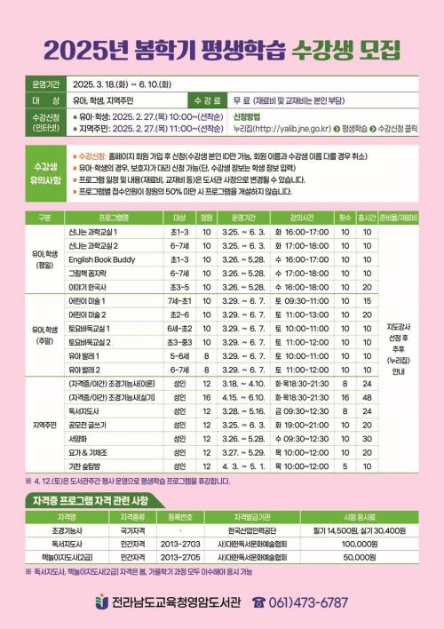[½Åµ¿¾Æ¹æ¼Û Àü³²¿µ¾Ï=À̽ŵ¿±âÀÚ] Àü¶ó³²µµ±³À°Ã»¿µ¾Ïµµ¼­°ü(±¸.¿µ¾Ï°ø°øµµ¼­°ü)Àº ¿À´Â 2¿ù 27ÀϺÎÅÍ ¿µ¾ÏÁö¿ª À¯¾Æ․Çлý ¹× Áö¿ªÁÖ¹ÎÀ» ´ë»óÀ¸·Î 2025³â º½ÇÐ±â Æò»ýÇнÀÇÁ·Î±×·¥ ¼ö°­»ýÀ» ¸ðÁýÇÑ´Ù°í ¹àÇû´Ù. º½ÇÐ±â Æò»ýÇнÀÇÁ·Î±×·¥Àº À¯¾Æ¿Í Çлý ´ë¡¦