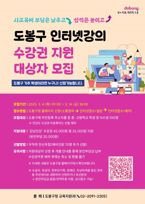 [½Åµ¿¾Æ¹æ¼Û µµºÀ±¸=À̽ŵ¿±âÀÚ] µµºÀ±¸°¡ ÀÎÅÍ³Ý ¼ö´É¹æ¼Û ¡®°­³²Àΰ­¡¯ ¼ö°­±Ç Áö¿ø ´ë»óÀÚ¸¦ ¸ðÁýÇÑ´Ù. ¾Õ¼­ ±¸´Â Áö³­ 2023³â Áö¿ª ³» Áß‧°íµîÇб³ ÇлýÀÇ »ç±³À°ºñ ºÎ´ãÀ» ¿ÏÈ­Çϱâ À§ÇØ °­³²±¸¿Í ¡®°­³²Àΰ­¡¯¿¡ ´ëÇÑ °øµ¿ÀÌ¿ëÇù¾àÀ» ü°áÇß´Ù. Áö¿ø¡¦