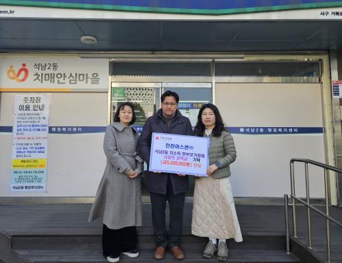[½Åµ¿¾Æ¹æ¼Û ÀÎõ= À±¹Î½Ä±âÀÚ] ÀÎõ ¼­±¸ ¼®³²3µ¿ ÇàÁ¤º¹Áö¼¾ÅÍ(µ¿Àå È«³ª°æ)´Â ¢ßÀÎõ¾Æ½ºÄÜ(´ëÇ¥ ±¸º»Áß)ÀÌ ÇѺθð°¡Á¤¿¡ 500¸¸ ¿ø »ó´çÀÇ ÀåÇбÝÀ» Àü´ÞÇß´Ù°í 7ÀÏ ¹àÇû´Ù. À̳¯ ±âºÎµÈ ÀåÇбÝÀº ¼®³²3µ¿¿¡ °ÅÁÖÇÏ´Â ÇѺθð°¡Á¤ 5°¡±¸¿¡ ¿ù 10¸¸ ¿ø¾¿ 10°³¿ù°£¡¦