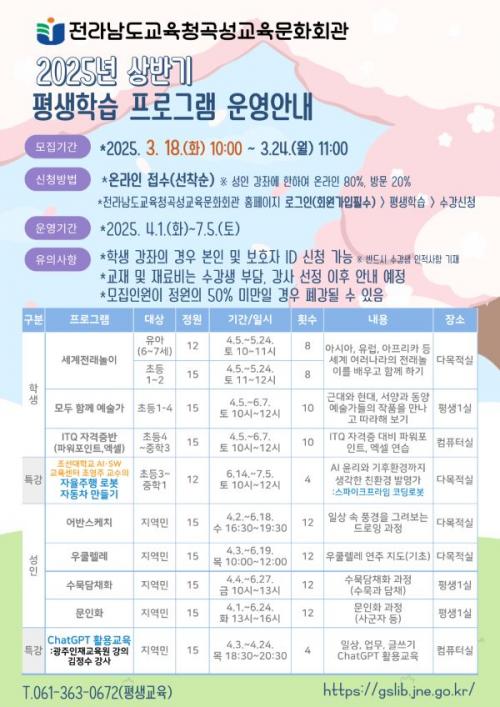 [½Åµ¿¾Æ¹æ¼Û Àü³²°î¼º=À̽ŵ¿±âÀÚ] Àü¶ó³²µµ±³À°Ã»°î¼º±³À°¹®È­È¸°üÀº 4¿ù 1ÀϺÎÅÍ 7¿ù 5ÀϱîÁö Çлý°ú Áö¿ª¹ÎÀ» ´ë»óÀ¸·Î¡®2025³â »ó¹Ý±â Æò»ýÇнÀ ÇÁ·Î±×·¥¡¯À» ¿î¿µÇÑ´Ù. ¿Ã »ó¹Ý±â¿¡ ¼±º¸ÀÌ´Â Çлý °­Á·δ¡®¼¼°èÀü·¡³îÀÌ¡¯,¡®¸ðµÎ ÇÔ²² ¿¹¼ú°¡¡¯, ¡®ÀÚÀ²ÁÖÇà ·Î¡¦