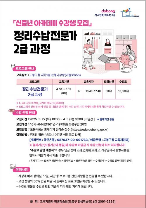 [½Åµ¿¾Æ¹æ¼Û µµºÀ±¸=À̽ŵ¿±âÀÚ] µµºÀ±¸°¡ ½ÅÁß³âÀ» ´ë»óÀ¸·Î ¡®Á¤¸®¼ö³³ Àü¹®°¡ 2±Þ °úÁ¤¡¯À» ¿î¿µÇÑ´Ù. º» °úÁ¤Àº ÃÖ±Ù 1ÀÎ °¡±¸, ¸Â¹úÀÌ °¡Á¤ÀÇ Áõ°¡¿¡ µû¶ó ´Ã°í ÀÖ´Â Á¤¸®¼ö³³¿¡ ´ëÇÑ À̵éÀÇ ¼ö¿ä¸¦ ÃæÁ·½Ã۰íÀÚ ¸¶·ÃµÆ´Ù. ¼ö°­»ýµéÀº º» °úÁ¤À» ÅëÇØ Á¤¸®¡¦