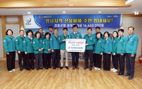 [½Åµ¿¾Æ¹æ¼Û Àü³²ÀåÈï=¹Ú±¤¿Á±âÀÚ] ±è¼º ÀåÈﱺ¼ö¿Í ÀåÈﱺû Á÷¿øÀÌ ¿µ³² Áö¿ª »êºÒ ÇÇÇØ º¹±¸¿Í ÇÇÇØ ÁֹΠÁö¿øÀ» À§ÇØ ±¸È£ ¼º±Ý 1,666¸¸¿øÀ» ±âºÎÇß´Ù°í 1ÀÏ ¹àÇû´Ù. ±¸È£ ¼º±ÝÀº À̹ø »êºÒ·Î ÇÇÇØ°¡ Å« °æºÏ ÀǼº±º°ú û¼Û±ºÀÇ »çȸº¹Áö ¸ð±Ý°èÁ¸¦ ÅëÇØ Àü´ÞµÉ¡¦
