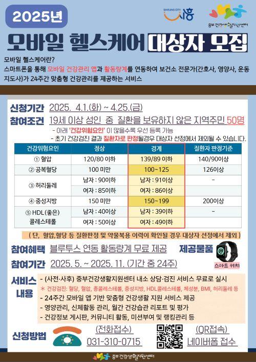[½Åµ¿¾Æ¹æ¼Û ½ÃÈï½Ã=À̽ŵ¿±âÀÚ] ½ÃÈï½Ã Áߺΰǰ­»ýȰÁö¿ø¼¾ÅÍ´Â 4¿ù 25ÀϱîÁö ¡®¸ð¹ÙÀÏ ÇコÄɾ Âü¿©ÀÚ¸¦ ¸ðÁýÇÑ´Ù. À̹ø »ç¾÷Àº ½º¸¶Æ®Æù ¾Û°ú Ȱµ¿·®°è¸¦ Ȱ¿ëÇØ º¸°Ç¼Ò Àü¹®°¡(°£È£»ç, ¿µ¾ç»ç, ¿îµ¿Áöµµ»ç)°¡ 24ÁÖ°£ ¸ÂÃãÇü °Ç°­°ü¸® ¼­ºñ½º¸¦ Á¦°øÇÏ´Â ÇÁ·Î±×·¥¡¦