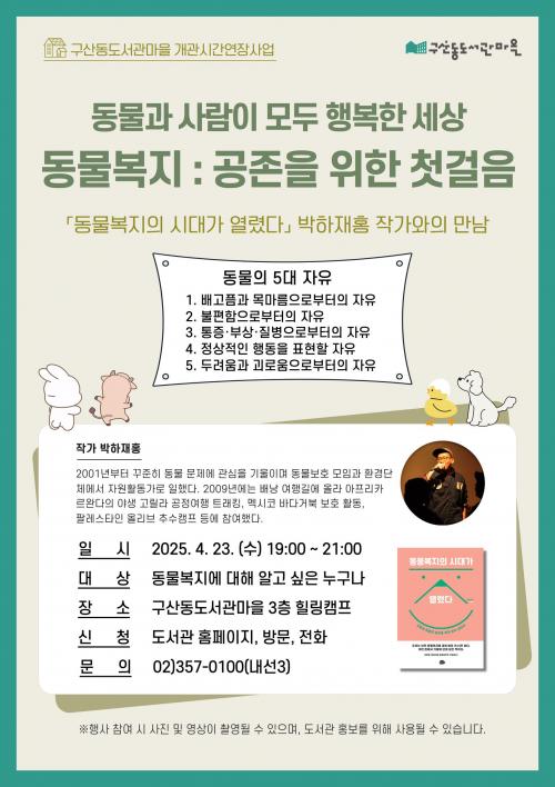 [½Åµ¿¾Æ¹æ¼Û ÀºÆò±¸=À̽ŵ¿±âÀÚ] ¼­¿ï ÀºÆò±¸´Â ±¸»êµ¿µµ¼­°ü¸¶À»¿¡¼­ µµ¼­°üÀÇ ³¯¡¤µµ¼­°ü ÁÖ°£À» ¸Â¾Æ ¡®µ¿¹°º¹ÁöÀÇ ½Ã´ë°¡ ¿­·È´Ù¡¯ ¹ÚÇÏÀçÈ« ÀúÀÚ¿ÍÀÇ ¸¸³²À» ¿À´Â 23ÀÏ¿¡ ¿ÀÈÄ 7½Ã¿¡ °³ÃÖÇÑ´Ù°í ¹àÇû´Ù. À̹ø °­¿¬Àº ±âÈÄ À§±â·Î µ¿¹°º¹ÁöÀÇ Á߿伺ÀÌ ÁÖ¸ñ¹Þ´Â ¡¦