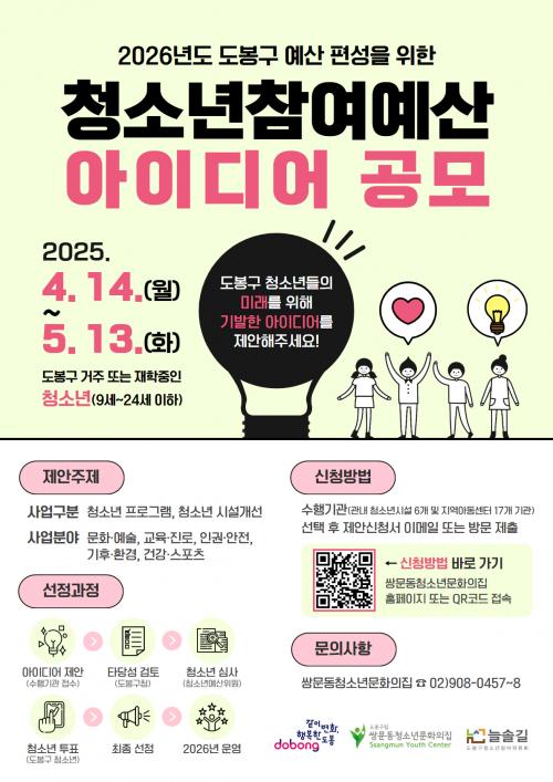 [½Åµ¿¾Æ¹æ¼Û µµºÀ±¸=À̽ŵ¿±âÀÚ] ¼­¿ï µµºÀ±¸°¡ 'û¼Ò³âÂü¿©¿¹»êÁ¦' ¾ÆÀ̵ð¾î °ø¸ð¸¦ 5¿ù 13ÀϱîÁö ÁøÇàÇÑ´Ù. ¡®Ã»¼Ò³â Âü¿©¿¹»êÁ¦¡¯´Â û¼Ò³âÀÇ Âü¿©¸¦ ½ÇÁúÀûÀ¸·Î º¸ÀåÇϰíÀÚ Ã»¼Ò³âÀÌ ÇÊ¿ä·Î ÇÏ´Â »ç¾÷°ú ¿¹»êÀ» Áö¿ª û¼Ò³âÀÌ Á÷Á¢ Á¦¾ÈÇÏ°í °áÁ¤ÇÏ´Â Á¦µµ´Ù. ¡¦