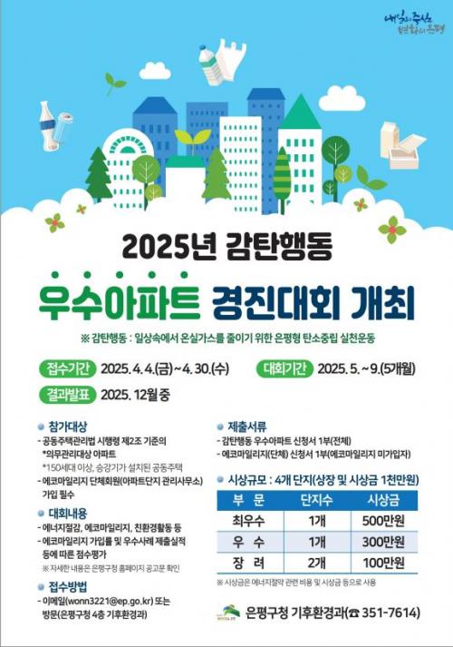 [½Åµ¿¾Æ¹æ¼Û ÀºÆò±¸=À̽ŵ¿±âÀÚ] ¼­¿ï ÀºÆò±¸´Â ÁֹεéÀÇ ¿¡³ÊÁö Àý¾à°ú ģȯ°æ ½ÇõÀ» Àå·ÁÇϱâ À§ÇØ ¡®2025³â °¨ÅºÇൿ ¿ì¼ö¾ÆÆÄÆ® °æÁø´ëȸ¡¯¸¦ °³ÃÖÇÏ°í ¿À´Â 30ÀϱîÁö ½Åû¹Þ´Â´Ù°í ¹àÇû´Ù. ¡®°¨ÅºÇൿ¡¯Àº ÀÏ»ó»ýȰ ¼Ó ¿Â½Ç°¡½º °¨ÃàÀ» À§ÇÑ ÀºÆòÇü ź¼ÒÁ߸³ ¡¦