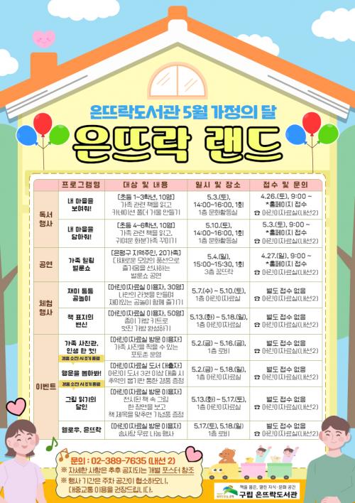 [½Åµ¿¾Æ¹æ¼Û ÀºÆò±¸=À̽ŵ¿±âÀÚ] ¼­¿ï ÀºÆò±¸´Â ±¸¸³ Àº¶ß¶ôµµ¼­°ü¿¡¼­ 5¿ù °¡Á¤ÀÇ ´ÞÀ» ¸Â¾Æ ¡®Àº¶ß¶ô ·£µå¡¯ Çà»ç¸¦ ¿î¿µÇÑ´Ù°í ¹àÇû´Ù. ¡®Àº¶ß¶ô ·£µå¡¯´Â °¡Á·ÀÌ ¼ÒÅëÇϰí È­ÇÕÇØ °Ç°­ÇÑ °¡Á·À» Á¶¼ºÇÏ´Â µ¥ µµ¿òÀ» ÁÖ°íÀÚ ¸¶·ÃµÆ´Ù. À̹ø Çà»ç´Â ³»´Þ 2ÀϺÎÅÍ 1¡¦