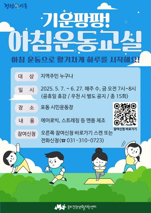 [½Åµ¿¾Æ¹æ¼Û ½ÃÈï½Ã=À̽ŵ¿±âÀÚ] ½ÃÈï½Ã Áߺΰǰ­»ýȰÁö¿ø¼¾ÅÍ´Â Áö¿ªÁÖ¹ÎÀÇ È°±âÂù ÇϷ縦 Ã¥ÀÓÁú ½ÅüȰµ¿ ÇÁ·Î±×·¥ ¡®±â¿î ÆÎÆÎ! ¾ÆÄ§¿îµ¿±³½Ç¡¯À» ¿À´Â 5¿ù 7ÀϺÎÅÍ 6¿ù 27ÀϱîÁö ¸ÅÁÖ ¼ö¿äÀϰú ±Ý¿äÀÏ ¿ÀÀü 7½ÃºÎÅÍ 8½Ã±îÁö Æ÷µ¿ ½Ã¹Î¿îµ¿Àå¿¡¼­ ¿î¿µÇÑ´Ù. À̹ø¡¦