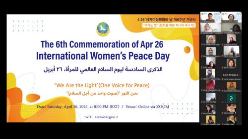 [½Åµ¿¾Æ¹æ¼ÛÀü³²¿©¼ö=±è±â³² ±âÀÚ] ©Å¼¼°è¿©¼ºÆòÈ­±×·ì(IWPG) ±Û·Î¹ú 2±¹(±Û·Î¹ú±¹Àå À̼­¿¬)ÀÌ 26ÀÏ ¡®4.26 ¼¼°è¿©¼ºÆòÈ­ÀÇ ³¯¡¯ Á¦6ÁÖ³âÀ» ¸Â¾Æ ¡®ÆòÈ­¸¦ À§ÇÑ ÇϳªÀÇ ¸ñ¼Ò¸®(One Voice for Peace)¡¯¸¦ ÁÖÁ¦·Î ±¹Á¦ ±â³ä½ÄÀ» ¼º°øÀûÀ¸·Î °³ÃÖÇß´Ù. À̹ø Çà»ç´Â ´ë¡¦
