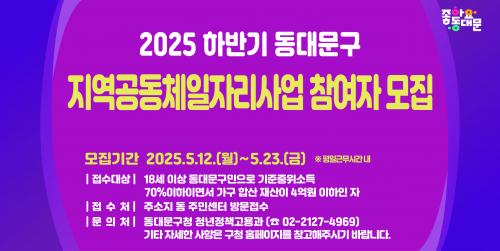 [½Åµ¿¾Æ¹æ¼Û µ¿´ë¹®±¸=À̽ŵ¿±âÀÚ] ¼­¿ï µ¿´ë¹®±¸´Â ¡®2025³â ÇϹݱâ Áö¿ª°øµ¿Ã¼ÀÏÀÚ¸®»ç¾÷¡¯¿¡ Âü¿©ÇÒ ±¸¹ÎÀ» ¸ðÁýÇÑ´Ù. À̹ø »ç¾÷Àº ¿ì¸® µ¿³× Ä®°¥ÀÌ¡¤¿ì»ê¼ö¸®, Áß¼Ò±â¾÷¡¤¼Ò»ó°øÀÎ Ãë¾÷Áö¿ø »ç¾÷, ã¾Æ°¡´Â ¹æ¹®¼Òµ¶ »ç¾÷, ã¾Æ°¡´Â ´Ù¹®È­ ÀÌÇØ±³À°, ²ÞÀÚ¶÷°øµ¿¡¦