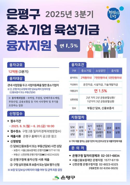 [½Åµ¿¾Æ¹æ¼Û ÀºÆò±¸=À̽ŵ¿±âÀÚ] ¼­¿ï ÀºÆò±¸´Â Áö¿ª ³» Áß¼Ò±â¾÷ÀÇ °æ¿µ ¾ÈÁ¤À» µµ¸ðÇϰí Àڱݳ­ ÇØ¼Ò¸¦ Áö¿øÇϱâ À§ÇØ ¡®2025³â 3ºÐ±â Áß¼Ò±â¾÷ À°¼º±â±Ý À¶ÀÚÁö¿ø¡¯À» ½ÃÇàÇÑ´Ù°í ¹àÇû´Ù. À̹ø 3ºÐ±â¿¡´Â ÃÑ 12¾ï ¿ø ±Ô¸ðÀÇ À¶ÀÚ±ÝÀÌ Æí¼ºµÇ¾úÀ¸¸ç, ÀºÆò±¸ °ü³» ¡¦