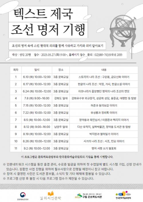 [½Åµ¿¾Æ¹æ¼Û ÀºÆò±¸=À̽ŵ¿±âÀÚ] ¼­¿ï ÀºÆò±¸´Â ¿À´Â 10ÀϺÎÅÍ ±¸¸³ Àº¶ß¶ôµµ¼­°ü¿¡¼­ Á¶¼±ÀÇ ¸íÀú¿¡ ´ëÇØ ¾Ë¾Æº¸´Â Àι®ÇÐ ÇÁ·Î±×·¥À» ¡®ÅؽºÆ® Á¦±¹, Á¶¼± ¸íÀú ±âÇ࡯À» ¿î¿µÇÑ´Ù°í ¹àÇû´Ù. ±¸´Â ¹®È­Ã¼À°°ü±¤ºÎ°¡ ÁÖÃÖÇÏ°í ¹®È­¿¹¼úÀ§¿øÈ¸°¡ ÁÖ°üÇÏ´Â ¡®2025³â ±æ¡¦