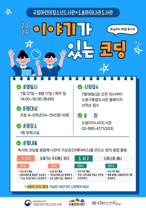[½Åµ¿¾Æ¹æ¼Û µµºÀ±¸=À̽ŵ¿±âÀÚ] ¼­¿ï µµºÀ±¸ µµºÀ¾ÆÀ̳ª¶óµµ¼­°üÀÌ ¡®2025³â À̾߱Ⱑ ÀÖ´Â ÄÚµù¡¯ °ø¸ð»ç¾÷¿¡ ÃÖÁ¾ ¼±Á¤, ¿À´Â 7¿ùºÎÅÍ 8¿ù±îÁö µ¶¼­¿Í ÄÚµùÀ» °áÇÕÇÑ Ã¢ÀÇ À¶ÇÕÇü ÇÁ·Î±×·¥À» ¿î¿µÇÑ´Ù. À̾߱Ⱑ ÀÖ´Â ÄÚµù °ø¸ð»ç¾÷Àº ±¹¸³¾î¸°ÀÌû¼Ò³âµµ¼­°üÀÌ ÁÖ¡¦
