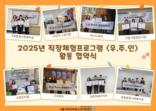 [½Åµ¿¾Æ¹æ¼Û ½ÃÈï½Ã=À̽ŵ¿±âÀÚ] (Àç)½ÃÈï½Ãû¼Ò³âÀç´Ü »êÇϱâ°üÀÎ ½ÃÈï½ÃÇб³¹Ûû¼Ò³âÁö¿ø¼¾ÅÍ(ÀÌÇÏ, Çб³¹Û¼¾ÅÍ)´Â Çб³ ¹Û û¼Ò³âÀÇ Áø·Î ¼³°è ¹× ÀÚ¸³À» À§ÇØ Á÷ÀåüÇè ÇÁ·Î±×·¥ ¡®¿ì¸®°¡ ÁÖÀÎÀÎ ÀÎÅÏ(ÀÌÇÏ, ¿ìÁÖÀÎ)¡¯À» ¿î¿µÇϰí ÀÖ´Ù. ¿ìÁÖÀÎ ÇÁ·Î±×·¥Àº ¿ÃÇØ¡¦