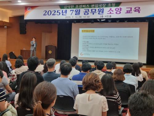 [½Åµ¿¾Æ¹æ¼Û °æ³²ÁøÁÖ=³²±Ã¿µ±â±âÀÚ] ÁøÁֽô 10ÀÏ ½Ãû 2Ãþ ½Ã¹ÎȦ¿¡¼­ Á¶¼±¹Ìµð¾î °æÁ¦Àü¹®¸ÅüÀÎ Á¶¼±ºñÁî ±è´öÇÑÆíÁý±¹ÀåÀ» ÃÊÃ»ÇØ °ø¹«¿ø 150¿© ¸íÀÌ Âü¼®ÇÑ °¡¿îµ¥ ¼Ò¾ç±³À°À» ½Ç½ÃÇß´Ù. À̹ø ±³À°Àº ¡®±â¾÷µµ½Ã ÁøÁÖ ¸£³×»ó½º¸¦ ÇâÇÏ¿©¡¯¸¦ ÁÖÁ¦·Î ÁøÁÖ K-±â¡¦
