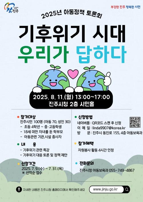 [½Åµ¿¾Æ¹æ¼Û °æ³²ÁøÁÖ=³²±Ã¿µ±â±âÀÚ] ÁøÁֽô ¾Æµ¿Ä£È­µµ½Ã °íµµÈ­¿Í ¾Æµ¿Á¤Ã¥ ¹ß±¼À» À§ÇØ ¿À´Â 8¿ù 11ÀÏ ÁøÁÖ½Ãû ½Ã¹ÎȦ¿¡¼­ °³ÃÖ ¿¹Á¤ÀΡ®2025³â ¾Æµ¿Á¤Ã¥ Åä·Ðȸ¡¯¿¡ Âü¿©ÇÒ Âü°¡ÀÚ¸¦ ¸ðÁýÇÑ´Ù°í ¹àÇû´Ù. ¸ðÁý ´ë»óÀº ÁøÁֽÿ¡ °ÅÁÖÇϰųª °ü³» Çб³¿¡ ÀçÇÐÁßÀΡ¦