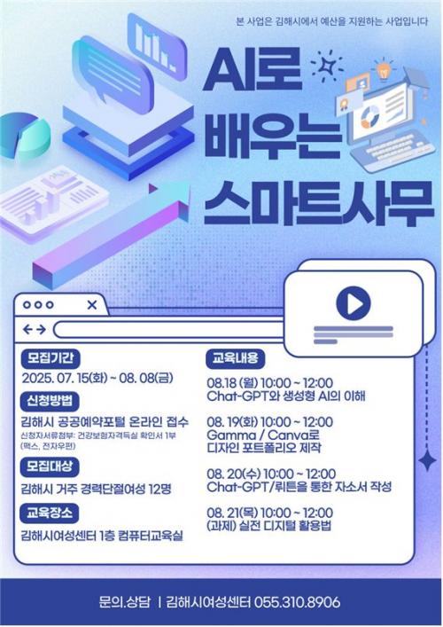 [½Åµ¿¾Æ¹æ¼Û °æ³²±èÇØ=³²±Ã¿µ±â±âÀÚ] ±èÇØ½Ã¿©¼º¼¾ÅÍ´Â ¿ÃÇØ¡¸AI·Î ¹è¿ì´Â ½º¸¶Æ®»ç¹«¡¹±³À° ÇÁ·Î±×·¥À» ±âȹ¡¤¿î¿µÇÏ¿©, µðÁöÅÐ ±â¹Ý »ç¹« ¿ª·®À» °®Ãá °æ·Â´ÜÀý¿©¼º ¾ç¼º¿¡ ³ª¼¹´Ù. ÇØ´ç ÇÁ·Î±×·¥Àº »ý¼ºÇü AI, µðÁöÅÐ µðÀÚÀÎ µµ±¸ µî ½Å±â¼ú¿¡ ´ëÇÑ ÀÌÇØ¿Í Ȱ¿ë ¡¦