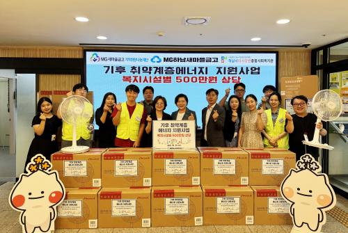 [½Åµ¿¾Æ¹æ¼Û Çϳ²½Ã=À̽ŵ¿±âÀÚ] MG»õ¸¶À»±Ý°í Áö¿ªÈñ¸Á³ª´®Àç´ÜÀº ¹«´õÀ§ ¼Ó Ãë¾à°èÃþÀÇ °Ç°­ÇÑ ¿©¸§³ª±â¸¦ Áö¿øÇϰíÀÚ Çϳ²½Ã¹Ì»ç°­º¯Á¾ÇÕ»çȸº¹Áö°ü¿¡ ¿¡¾îÄÁ ¹× ¼±Ç³±â¸¦ Àü´ÞÇÏ¿´´Ù. À̹ø ³Ã¹æ±â±â Áö¿øÀº ¡®±âÈÄ Ãë¾à°èÃþ ¿¡³ÊÁö Áö¿ø »ç¾÷¡¯ÀÇ ÀÏȯÀ¸·Î Æø¿°¡¦